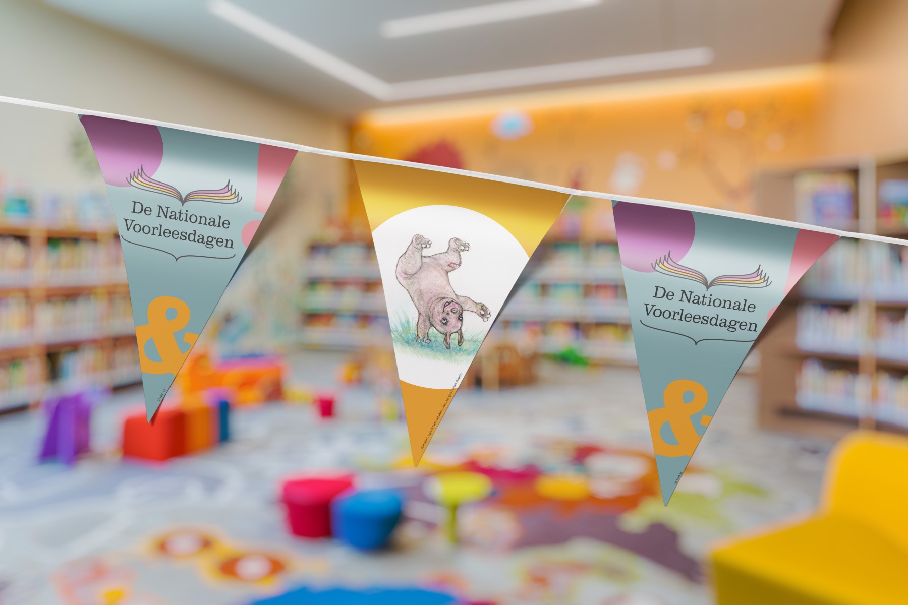 Natuurlijk hangen er vlaggenlijnen in alle bibliotheken en boekenwinkels ter promotie van de Nationale Voorleesdagen. Gemaakt van papier voor binnengebruik.